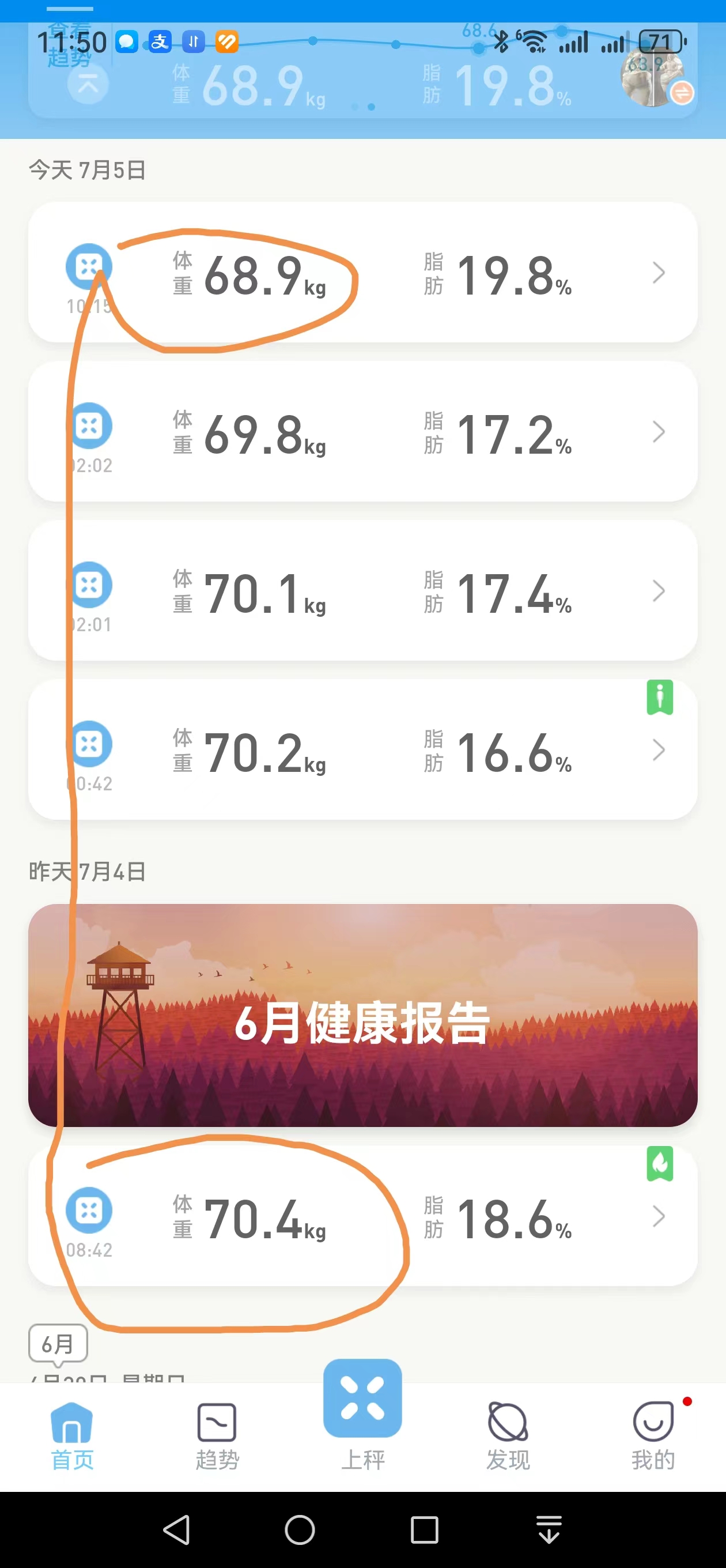 今天终于大幅掉秤了,离70KG只有一步之遥了,快则周一早晨,慢着则周二周三。 昨天爬楼 46层楼, 因为小腿酸胀,所以保守一点,不再加量 今天没有上班爬楼,加上晚上去父母家吃饭,所以今天掉秤很悬,所以我调整一下: 下午去理发时,用间歇跑2公里,晚上回来,再爬楼48层 另外,晚上去父母家,菜少吃点,藕肉丸子打包回来吃,现场不吃了。